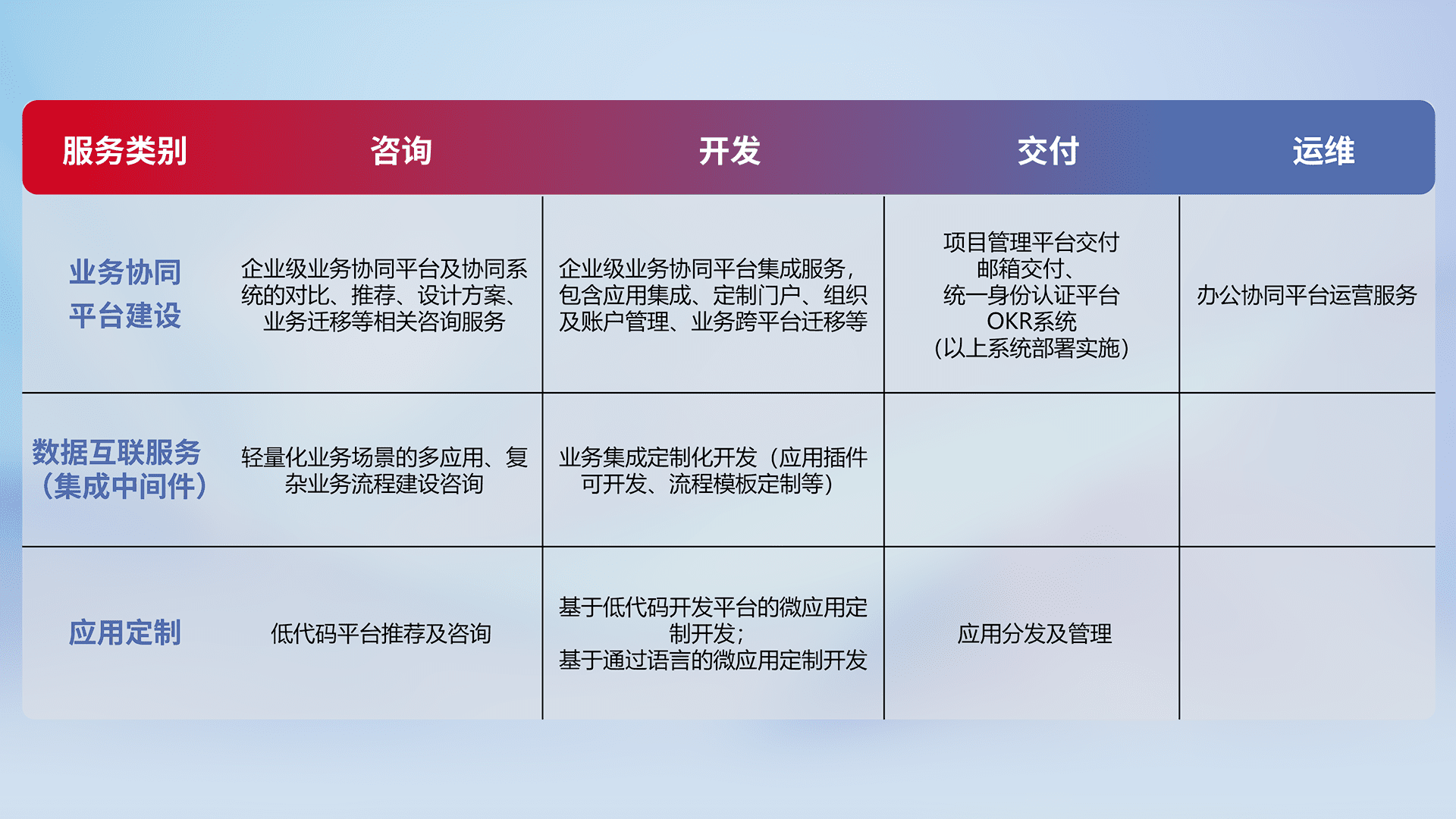针对钉钉、、、、企微、、IDaas等平台级产品提供产品的规划、、、、方案、、交付、、、定制化开发等服务,,,,实现如统一协同办公、、智能客户服务、、、混合会议管理、、智能数据查询、、、等业务场景,,,实现数字化转型。。。