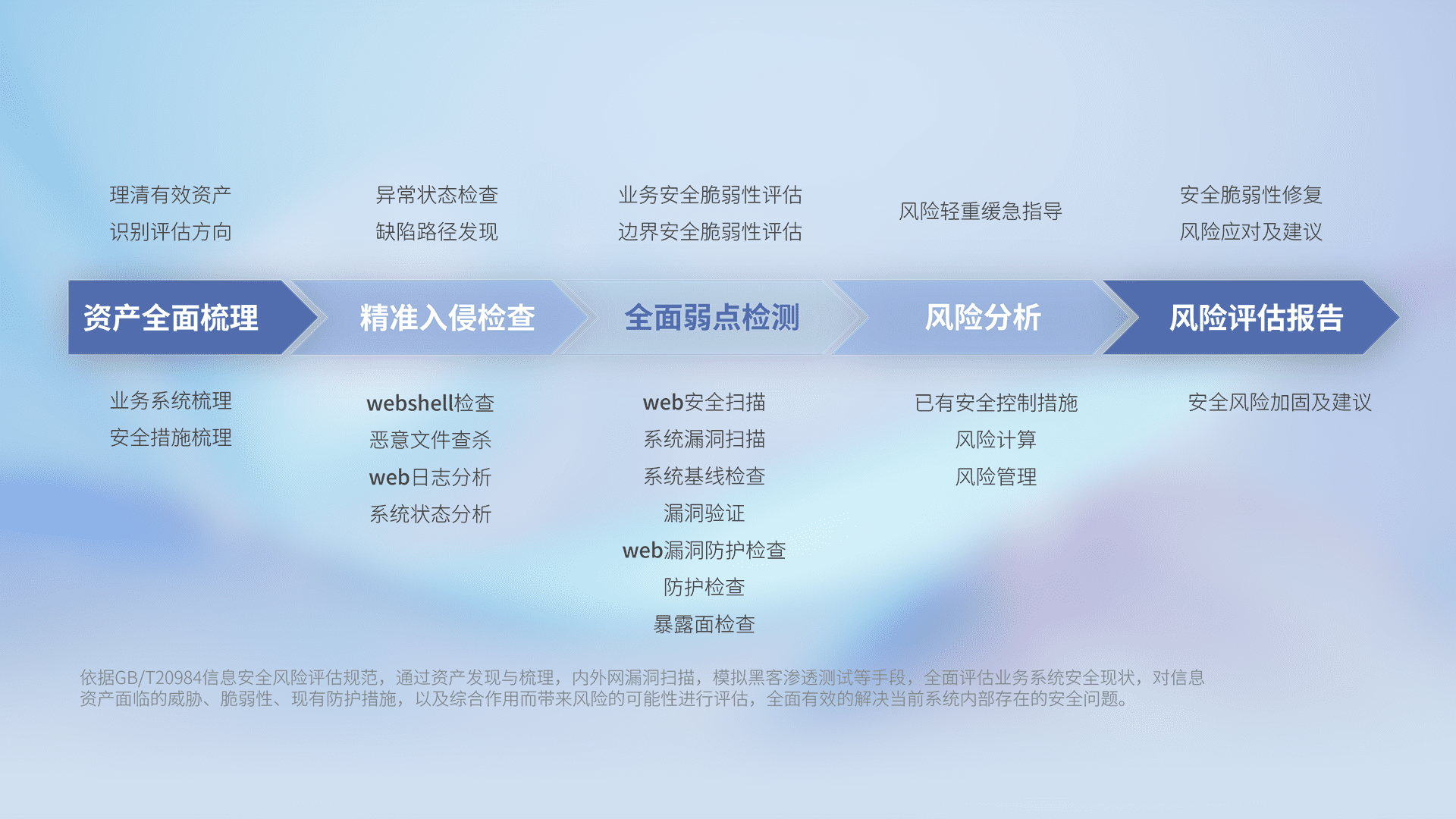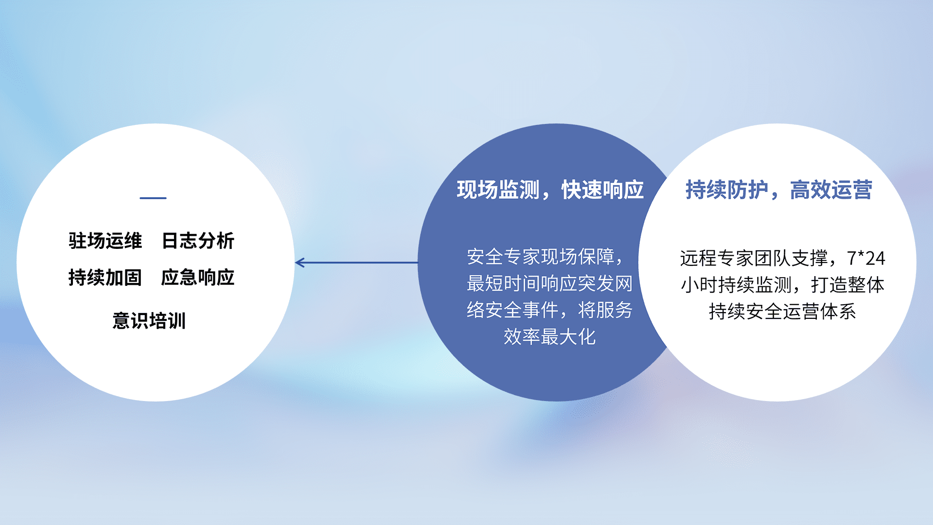 针对客户行业特性,,,,以专业的安全服务+多厂商联合解决方案提供专属的一站式安全管理服务,,,帮助客户全面感知网络空间威胁,,,,基于识别、、、检测、、、、分析、、、防护、、监测、、、、响应的服务理论模型,,从方案咨询、、、集成交付、、、、评估验证、、优化加固、、运维运营,,致力于为客户提供完整的闭环管理式安全服务。。以实战经验为客户打造高抵御风险的安全体系,,帮助客户发现威胁、、对抗威胁、、处置威胁,,,不断积累安全对抗能力,,持续保障数字化安全。。